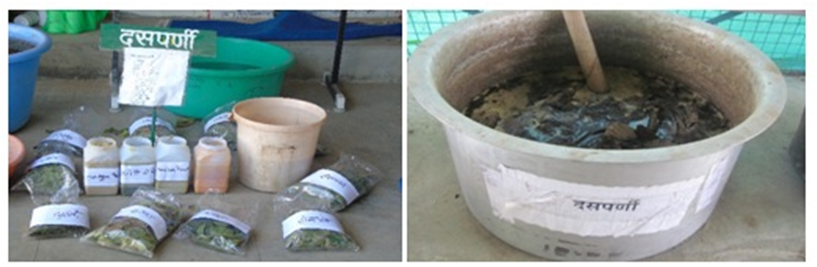 - तैयार मिश्रण में नीम, करंज, सीताफल, धतूरा, बेल, तुलसी, पपीता, करंज, कनेर तथा गेंदा की पत्ती की चटनी डाले और डंडे से हिलायें।