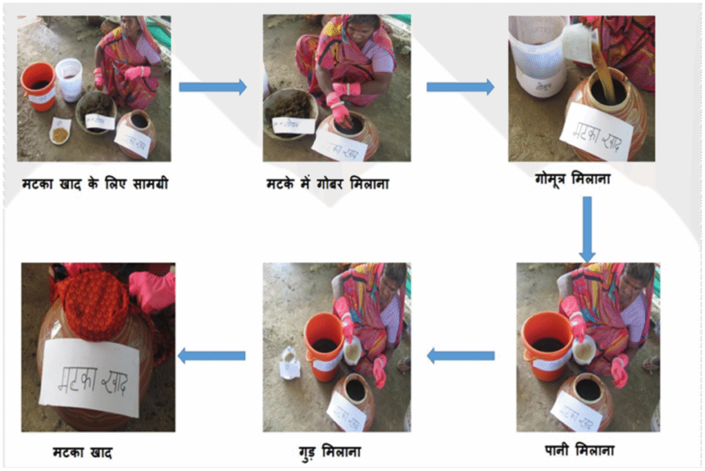 - 5 कि.ग्रा. ताजा गोबर, 5 लीटर गोमूत्र तथा 5 लीटर पानी मिट्टी के घडे़ में घोल लें। उसमे 250 ग्राम गुड़ भी मिला दें।